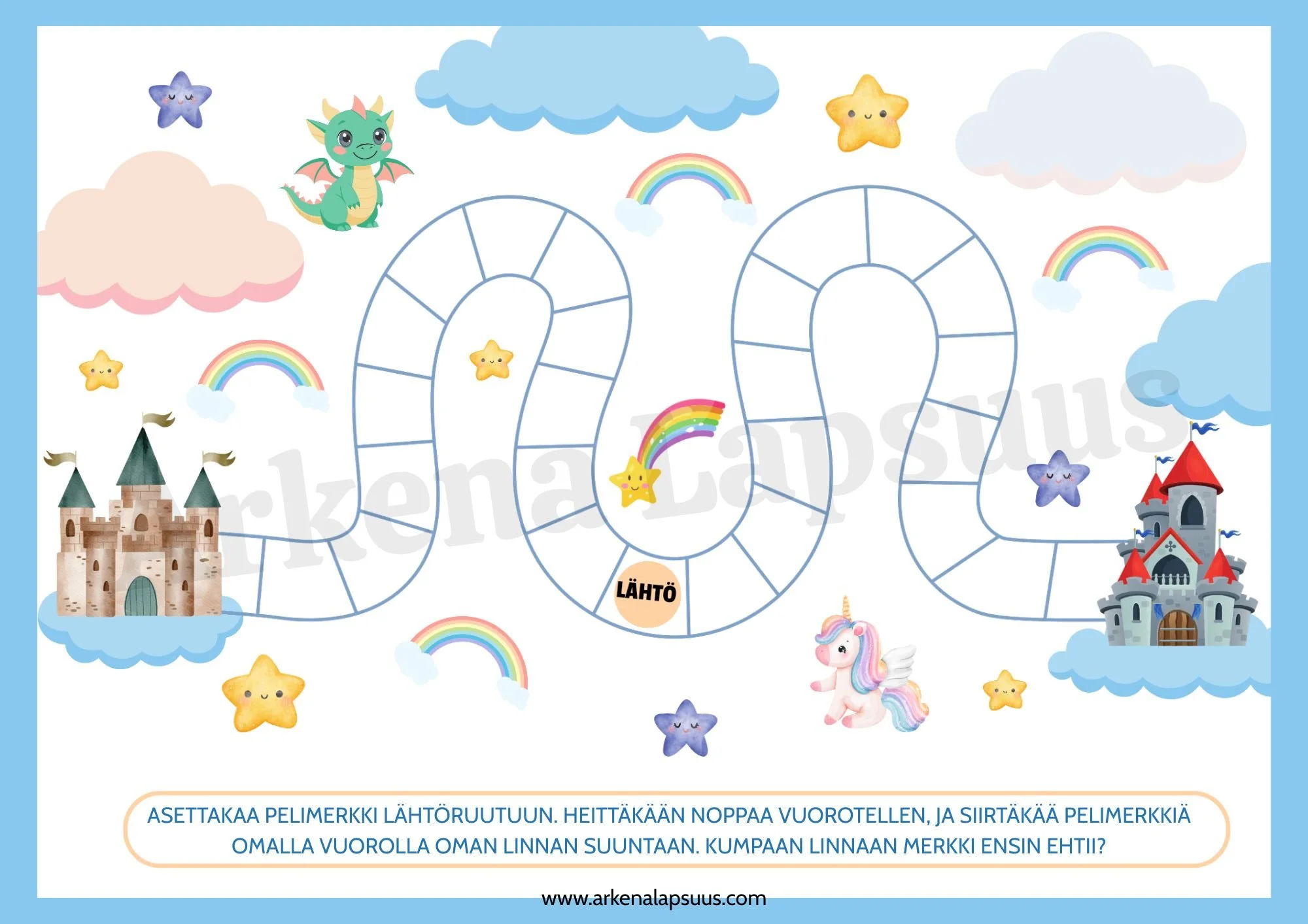 Tässä yksinkertaisessa mutta kivassa lautapelissä kaksi pelaajaa kilpailee siitä, kumpi saa pelimerkin ensin omaan linnaansa. Pelissä on vain yksi pelimerkki, joka asetetaan aluksi pelilaudan keskelle. Pelaajat heittävät vuorotellen noppaa, ja siirtävät pelimerkkiä omalla vuorollaan kohti omaa linnaansa nopan silmäluvun verran. Voittaja on se, jonka linnaan nappula lopulta saapuu! Peliin tarvitaan siis pelilaudan lisäksi noppa ja yksi pelimerkki.