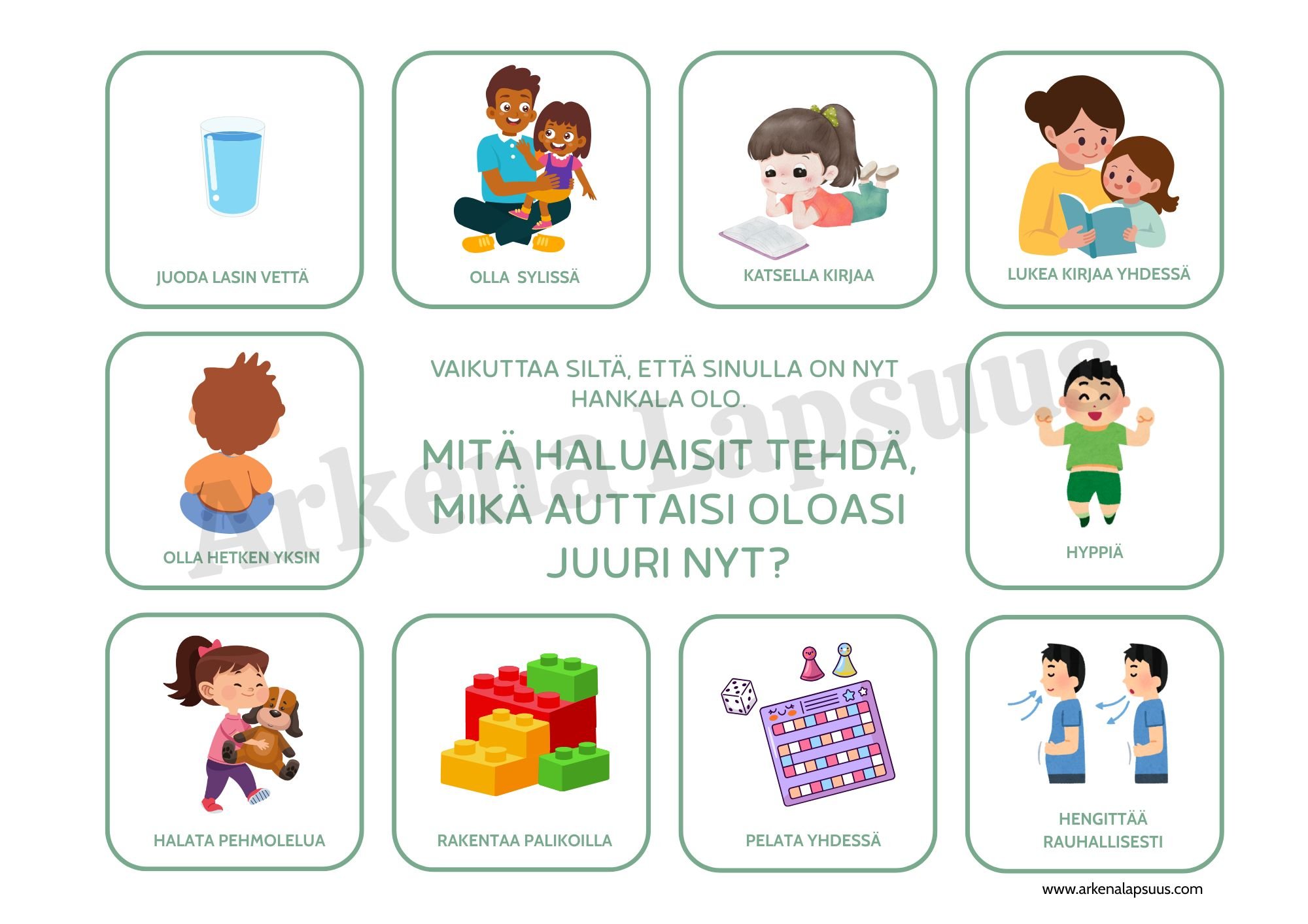 Miltä sinusta tuntuu, kun -taulu sisältää erilaisia tilanteita, joiden avulla lapset voivat pohtia omia tunteitaan. Kuvia ei ole tarkoituksella sanallistettu, jotta voitte ensin yhdessä miettiä, mitä kuvassa tapahtuu. Kannattaa myös pohtia, miltä eri henkilöistä kuvassa saattaa tuntua.